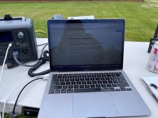 Meadow Day was going to use technology of 2023 - Starlink, laptop, VOIP telephone, video conferencing, and a portable battery bank being charged with a solar panel.