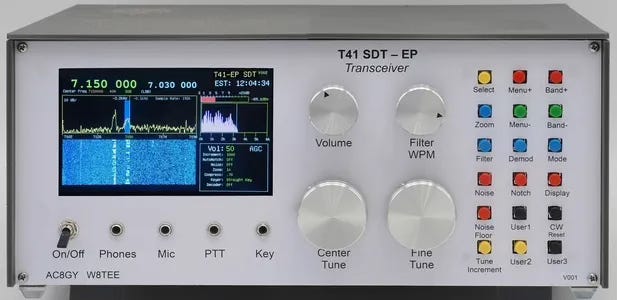 The T41-EP SDT is a software defined transceiver designed by Albert F Peter (AC8GY) and Dr. Jack Purdum (W8TEE) with later contributions by John Melton (G0ORX), Bill Schmidt (K9HZ), Oliver King (KI3P), and others. It is fully open-source hardware and software with an amazing community behind it.